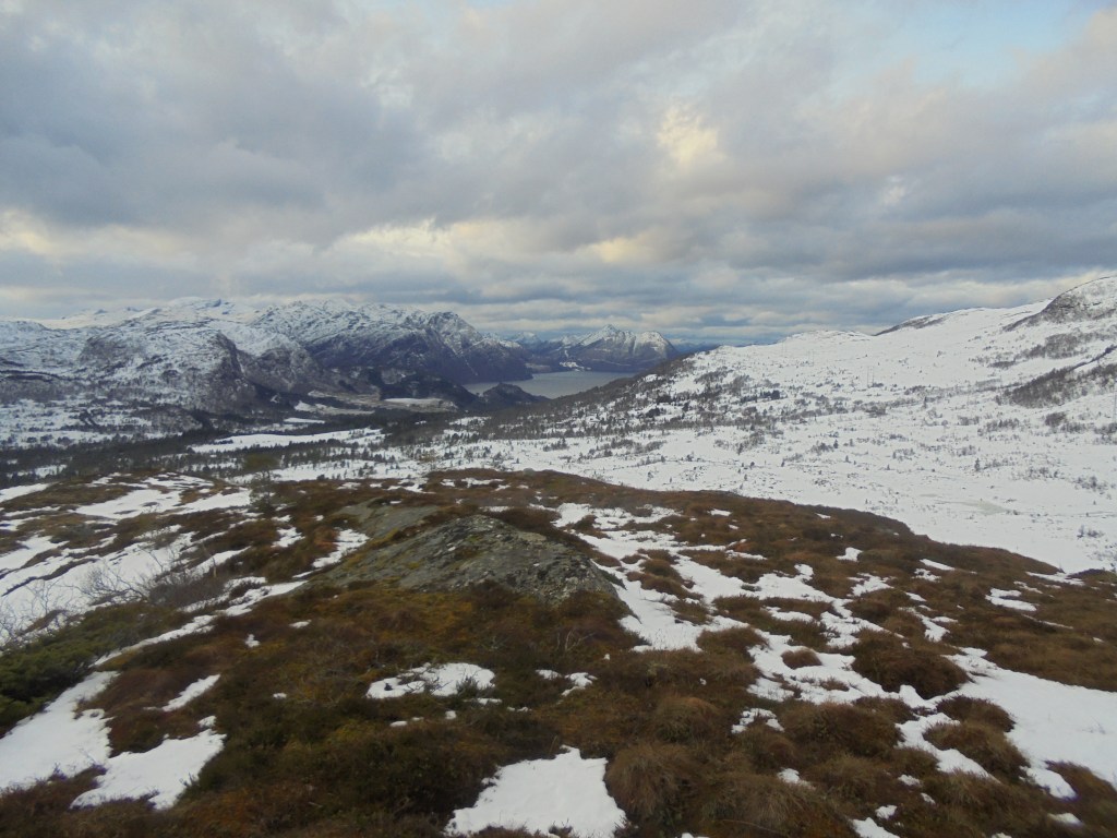 6. januar: Vest-sørvest laber bris, pluss sju grader. Skiføre anna enn på dei avblesne ryggane. Ser mot storfjorden.