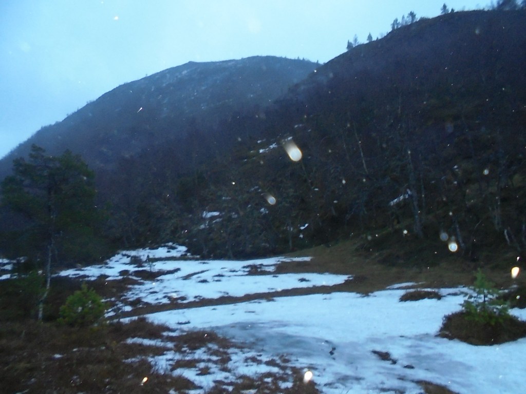 23. januar: Vest bris med regn oppå fjellet. Komen langt ned her, vinden har auka til kuling. Ser oppover mot Hallvardfjellet, med toppen gøymd bakom.