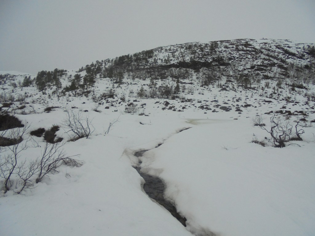 9. februar: Ved varmestova. Ser mot nord. Svak vind eller lett bris i terrenget. Ein flokk dompap var det som var å sjå ved løypene i dag.