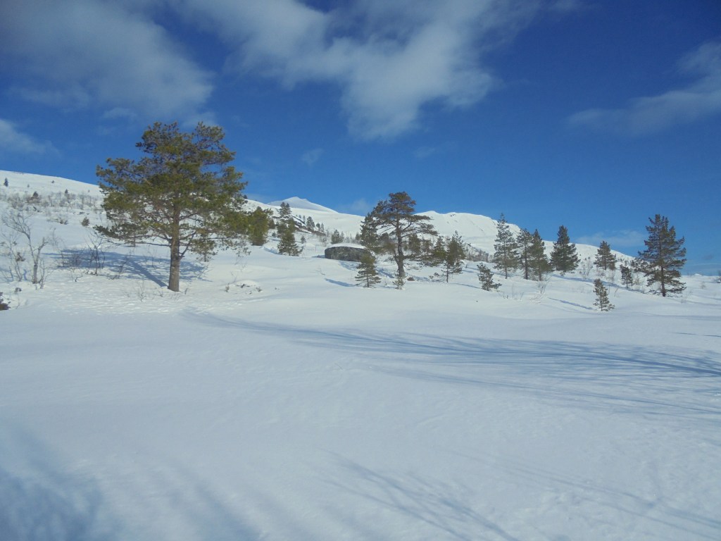 6. mars 2020: Ser opp i lia retning Åsrørene. Høgsvora og Næremstindan stikk opp utan å vere markerte. Bris og plussgrader på dagtid.