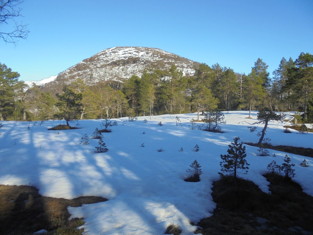 22. april: Snøen ligg oppå, og er blaut no på tidleg kveldstid. Men lia var turr opp frå fjorden. Ser mot Hallvardfjellet.