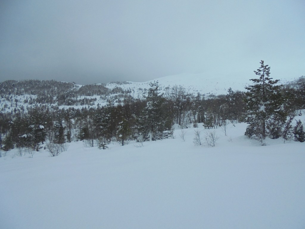 16. mai ettermiddag: Like nord for setra. Ser mot nord. Her ligg 80 cm snø, alt er nysnø frå siste åtte dagane. Tungt å gå oppover. Føret nedover var rimeleg. Spreidde byer, rolege vindtilhøve. Stilt fugleliv, men ein måltrast sette i å synge litt nedafor her.