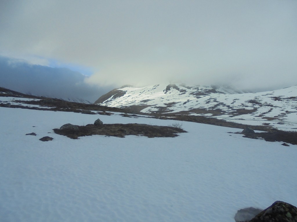 7. juni om kvelden: Komen ned frå sørenden av Blåfjellet. Fjellet som ligg i skodda er Kvitnykja, og Kjersemdalen ligg til venstre i bakgrunnen. Ei byge med sludd og regn har letta, og skodda som låg oppå Blåfjellet har også letta. Der bles det svak vind frå vest. Såg nokre fjuper på turen, trur alle var skogarjuper. Kom over eit ringtrastreid med fire egg nede under einebusker. Høyrde også ein enkeltbekkasin i dette terrenget, og ein raudvengetrast song i nærleiken.