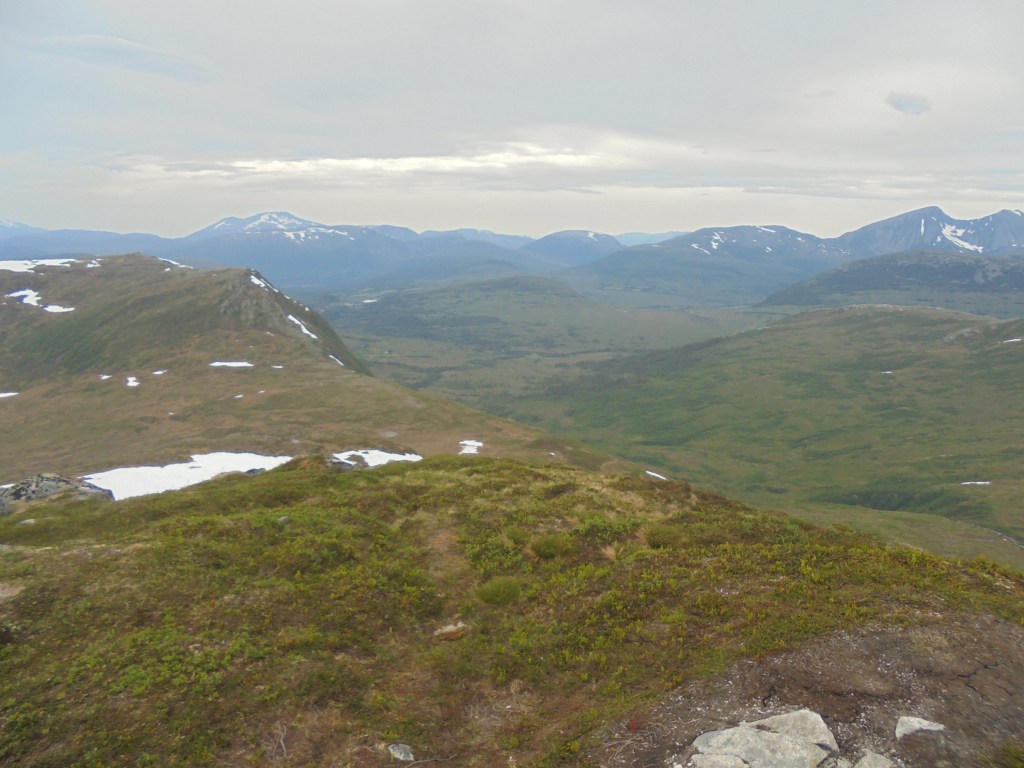 28. juni 2020: Søndag førmiddag. Oppe på Geitnibba. Frisk bris frå sør og høg lufttemperatur som gjer det mildt trass i vinden. Ser mot nordvest. Blåskjerdingen langt ute og noko til venstre i bildet. Brustinden og Ytstetinden heilt til høgre.