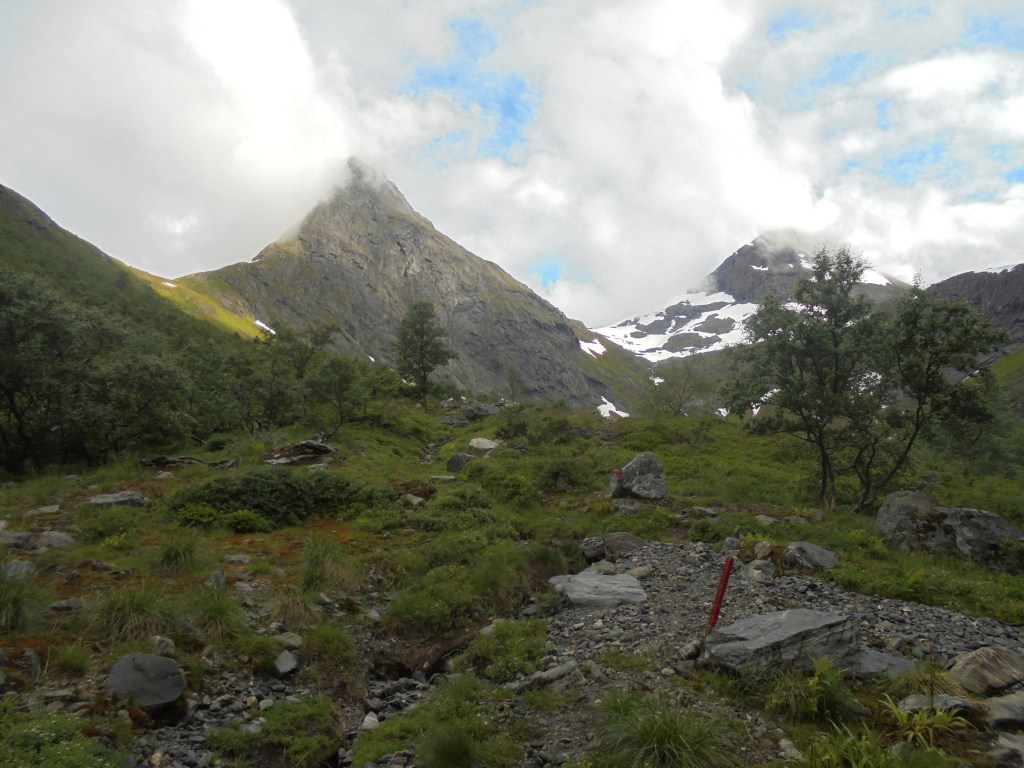 10. juli: Fredag ettermiddag. Har regna smått ei stund, og no har det letta. Ser innover dalen mot Litleskorkja og Rollsbotnskorkja. Turen vidare går opp i skaret til venstre for Litleskorkja.