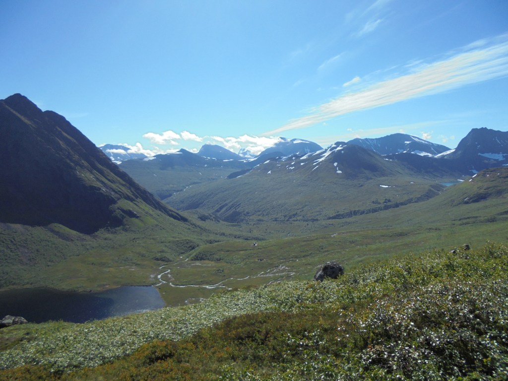 Nokre av fjella kring Måndalen. Skjervan, Middagstinden og Nonstinden med litt skodde. Vidare mot høgre Lissjevasstinden og Trollvasstinden.