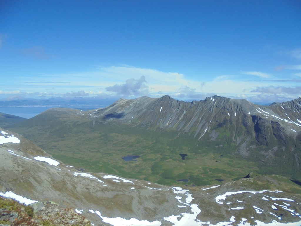 Trolltinden og Svartvasstinden ruvar mest. Romsdalsfjorden til venstre.