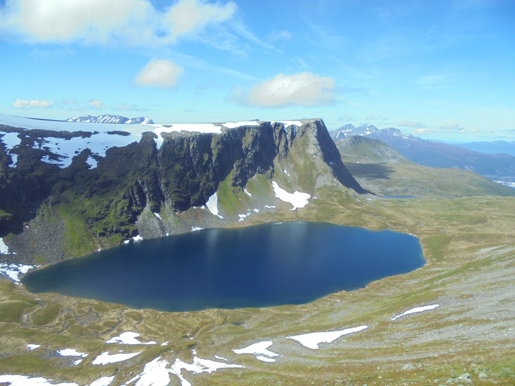 Går nedover vestsida mot Instevatnet. Blåfjellet på bortsida. Fjella som stikk fram til høgre er Brustinden, Ytstetinden og Remmemstinden.