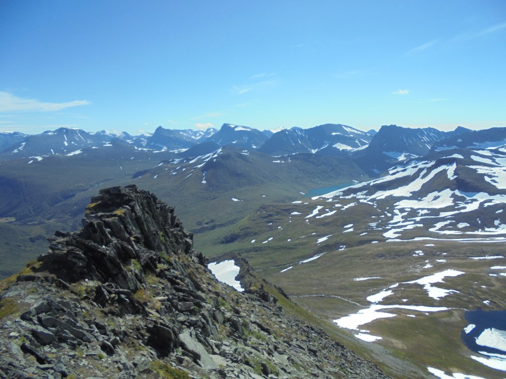Mot aust. Frå venstre ruvar Finnan, Middagstinden, Nonstinden, Lissjevasstinden og Trollvasstinden mest.