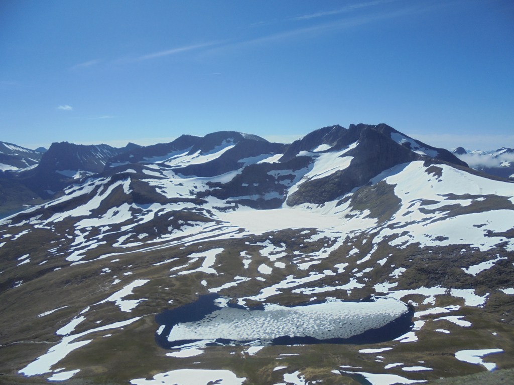 Mot søraust. Frå høgre dominerer Sandfjellet, Storbua og Trollvasstinden. Til høgre lengre borte stikk Rollsbotnskorkja markant opp som ein mørk flekk.