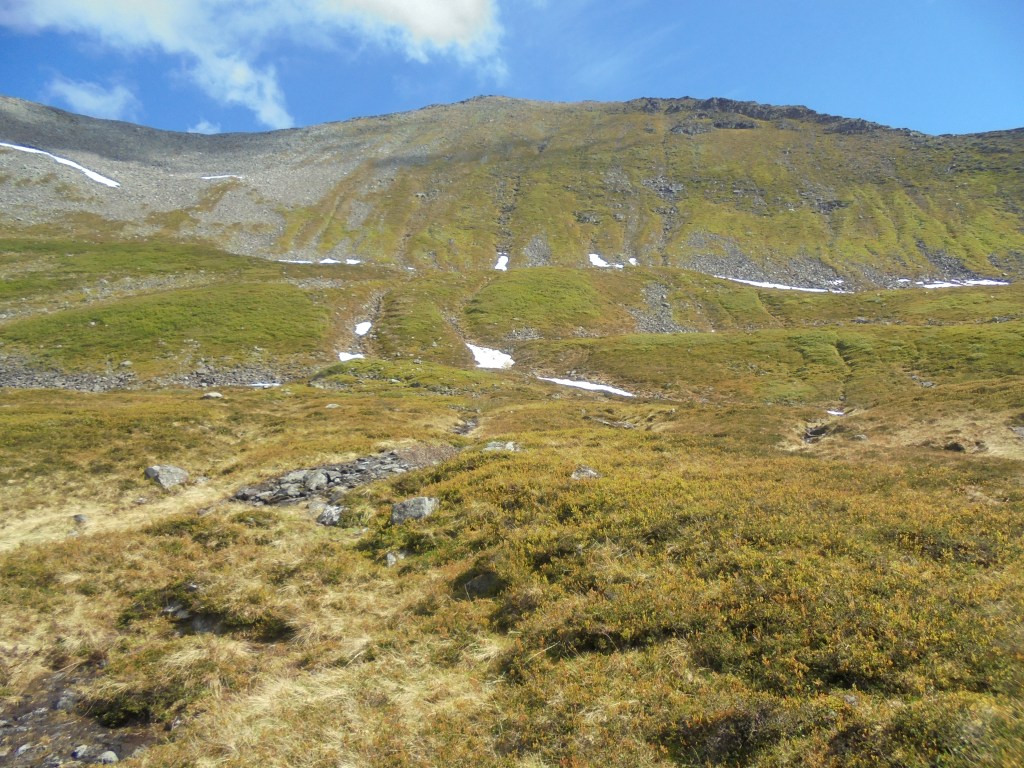 Tilbakesyn frå Instevatnet mot Øspetinden som ligg midt oppe i bildet. Gjekk først eit lite stykke nedover ryggen til høgre, og deretter ned den bratte fjellsida, som er tung å gå i, men elles grei.