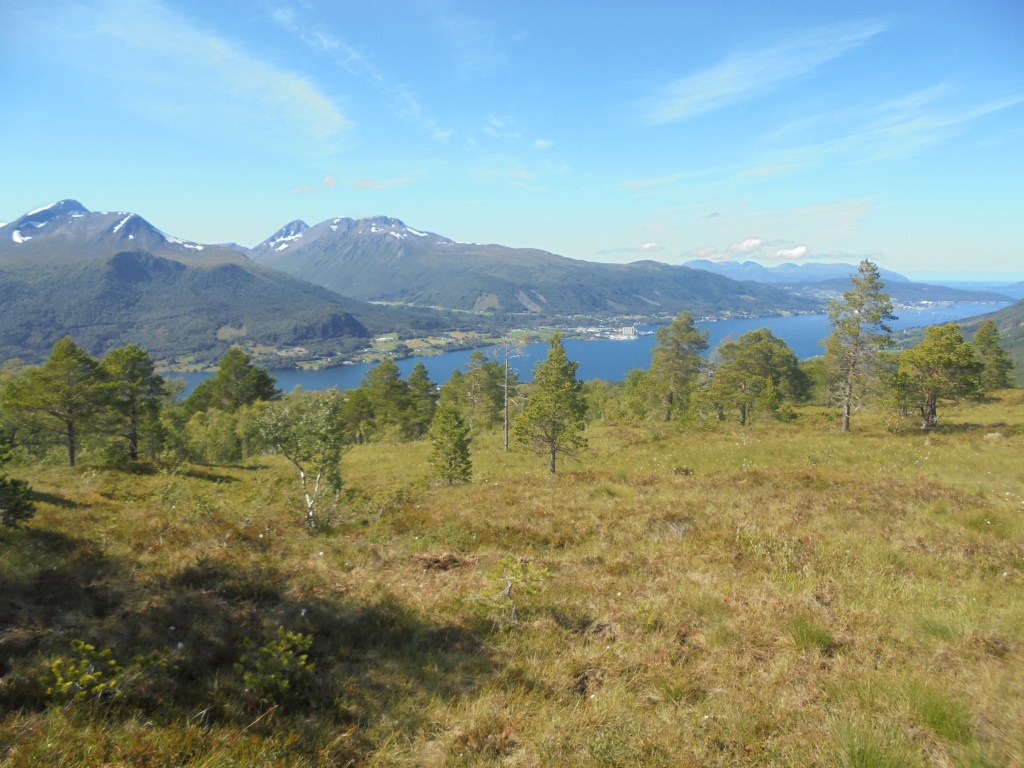 Ser ned på Tresfjorden. Fjella er Sprovstinden, Brustinden, Ytstetinden og Remmemstinden. E39 ligg som ei markant stripe bortafor fjorden.