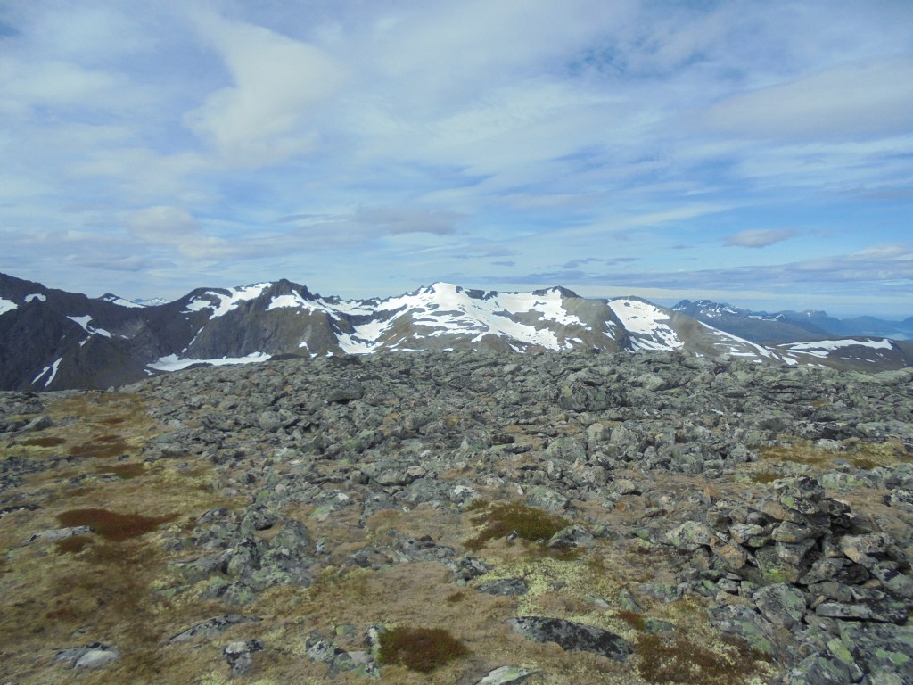 Søndag førmiddag 26. juli 2020: På toppen. Svak vind frå søraust og + 16 grader. Vinden var litt sterkare på søraustsida på veg opp til toppen. Ser mot vest, med Svartvasstinden og Trolltinden dominerande i bildet. Lengre borte til høgre trer Brustinden, Ytstetinden og Remmemstinden fram.