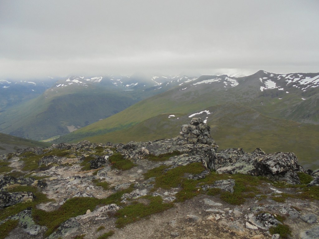 Ser mot sør. Fjella på sørsida av Måndalen stikk opp i skodda.