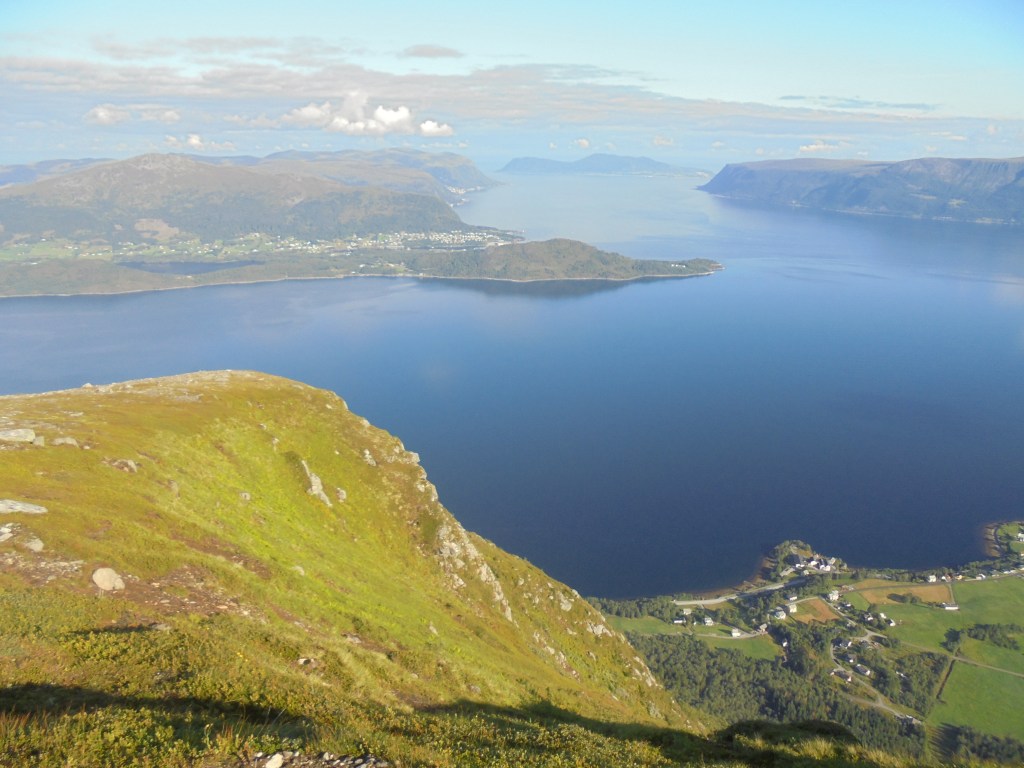 Søndag 9. august: Ser utover mot Liavågen, Hjørungneset Godøya og Sula. Vått i marka, kjølig luft med lett bris frå aust.