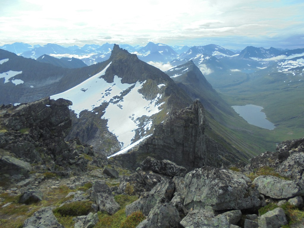 Søndag 2. august: På toppen. Flau vind og godt og mildt. Ser mot søraust. Svartvasstinden nærast.