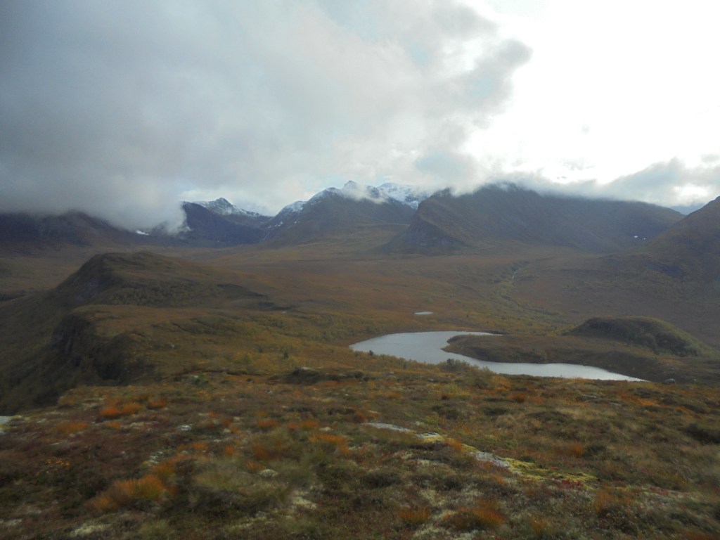 Kroketevatnet til høgre, Skurfjellet bortafor til venstre. I bakgrunnen trer Grytavasstinden mest fram litt til venstre.