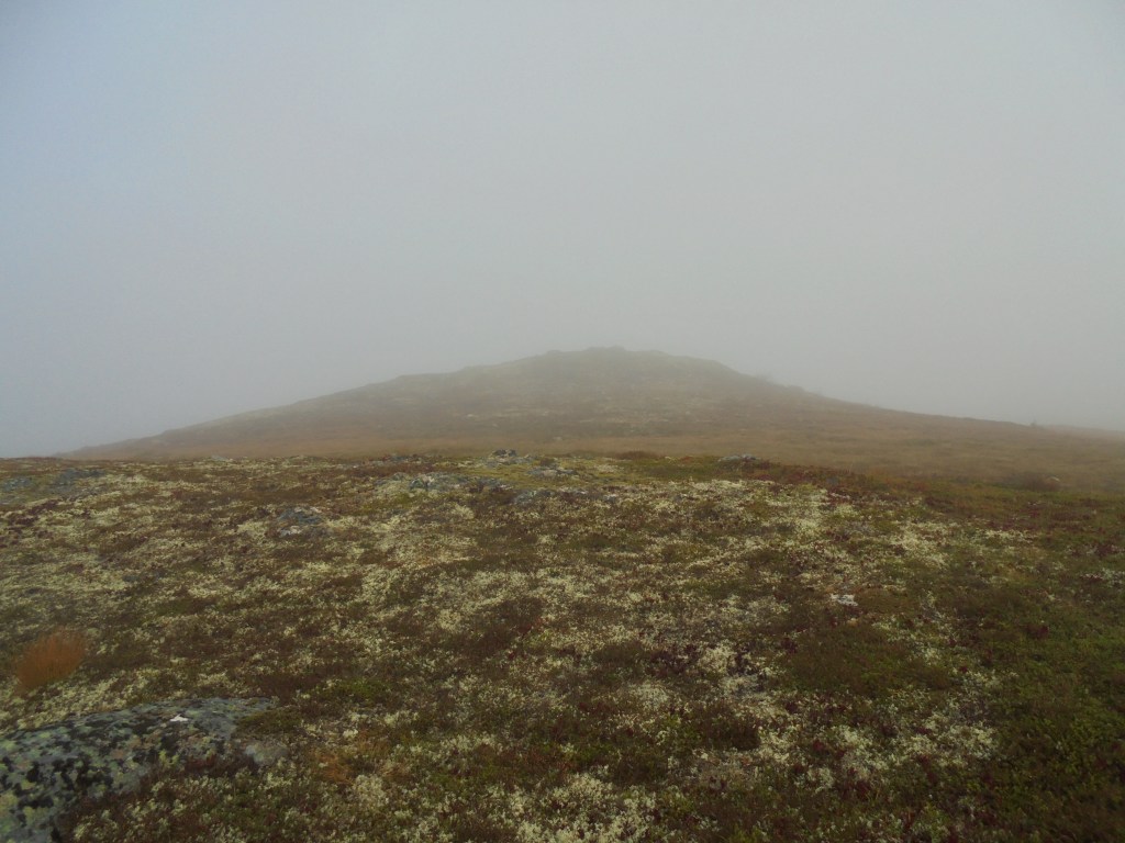 11. oktober: Oppe på toppen. Svak vind frå nord, og skodda ligg kringom. Men ser i blå himmel, og sola skin sovidt gjennom.