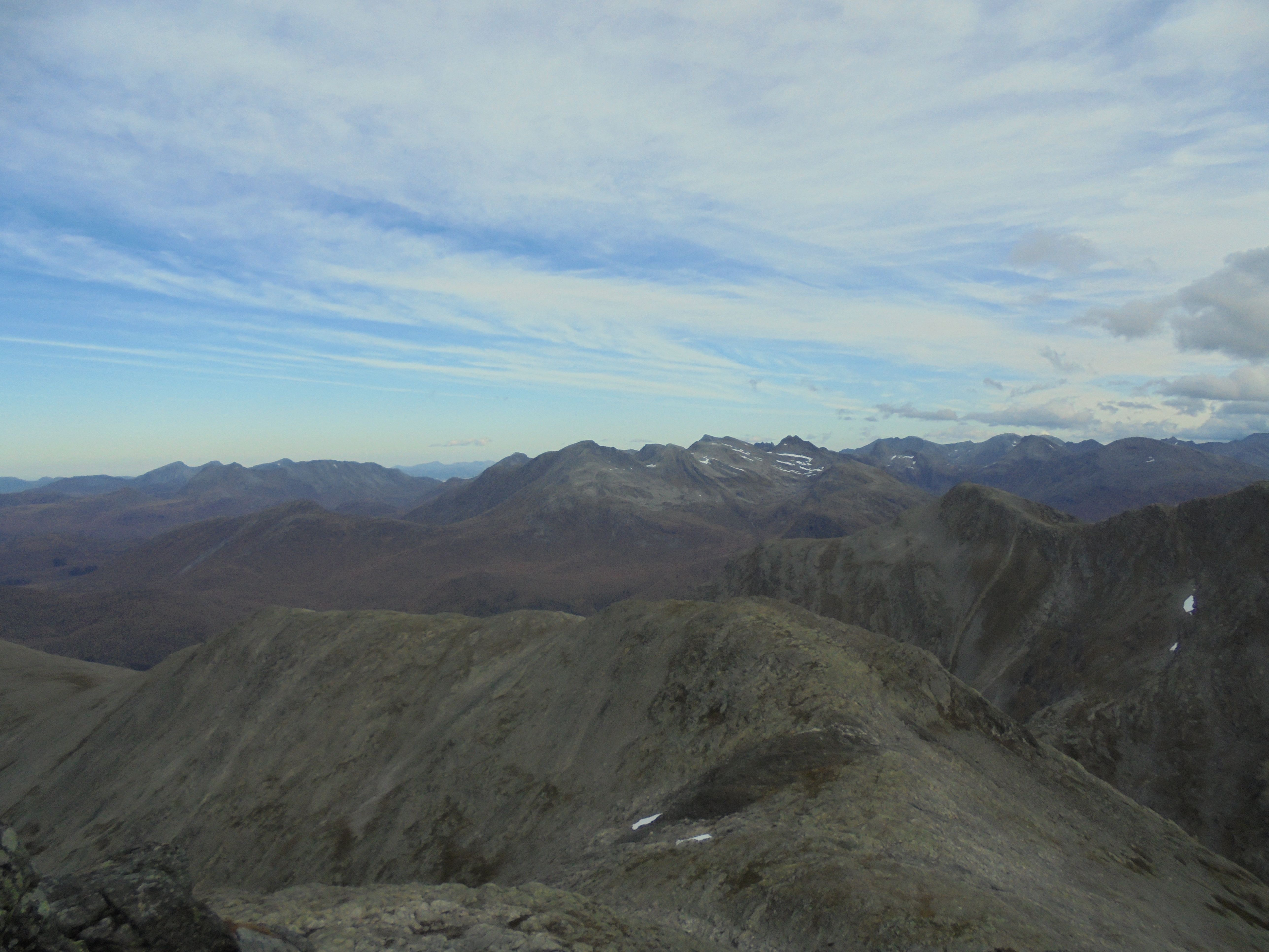Søndag 4. oktober 2020: Oppe ved varden. Søraust sterk kuling, men meir skjerma på lesida. Temperaturen er høg for årstida. Ser mot nord. Fjella i bakgrunnen er m.a. Brustinden, Ytstetinden, Høgsvora, Næremstindan, Kvitnykja, Heimste Skorkja, Lauparen, Storbotnshornet, Sandfjellet og Storbua.