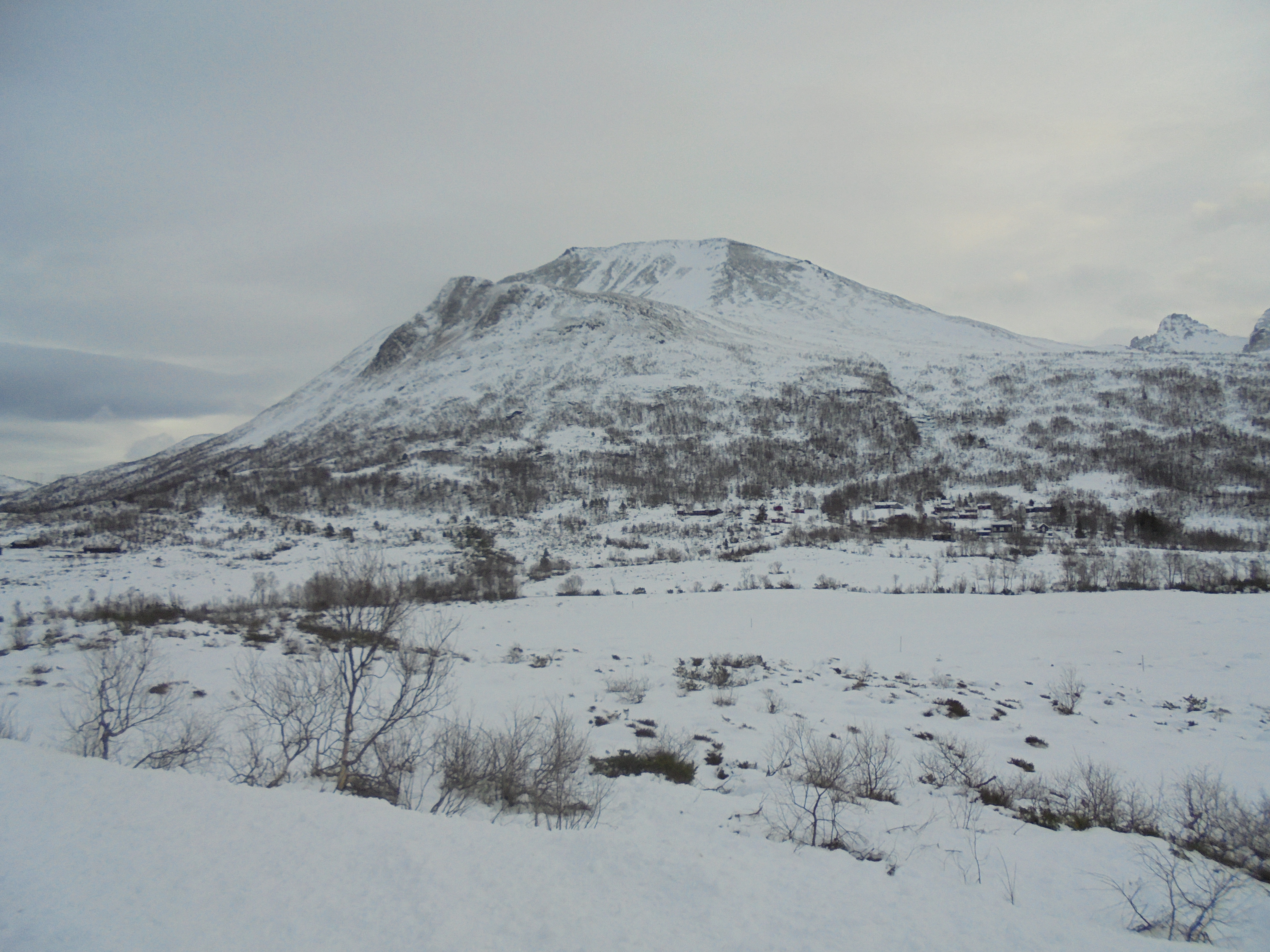 9. januar: Komen bort til varmestova. Ser mot Kvitnykja med Kjersemsætra hitom. Temperaturen har kome sovidt på plussida, og vinden har auka til frisk bris frå sør her. Oppe i Lissjebotnsrøra blæs det sterkare, og snøen ryk utfor bratte fjellet (litt til venstre). Skiløypa var rimeleg god, men treng påfyll av nysnø. Dette er ein opptrekkssituasjon, og på ettermiddagen var vinden sterkare, skydekket tyngre, og nedbøren kom etter det var mørkt.