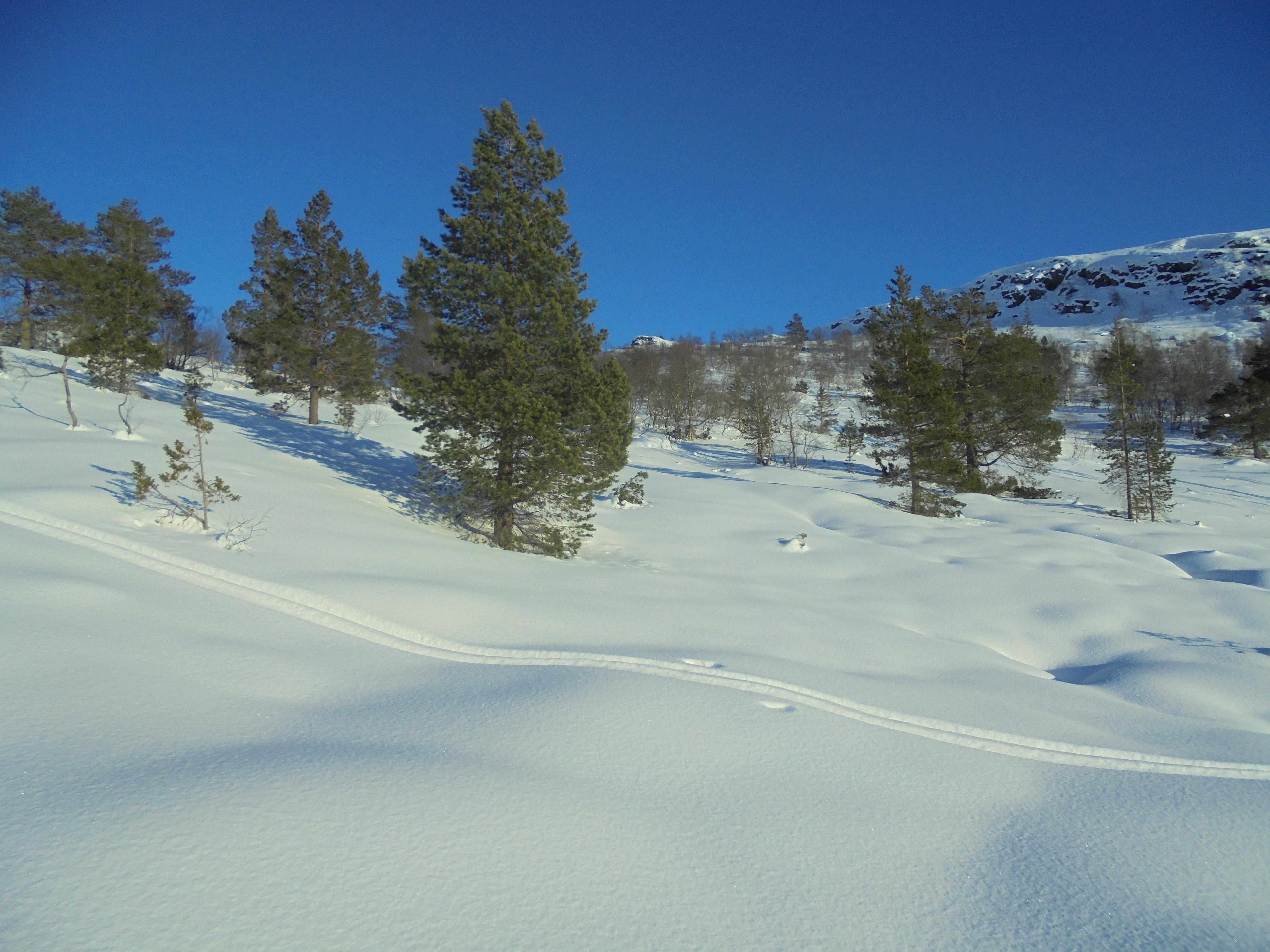 11. februar: I same terrenget. Opplett sidan sist, og fleire løyper, og meir trakka løyper. Grønnykjen til høgre.
