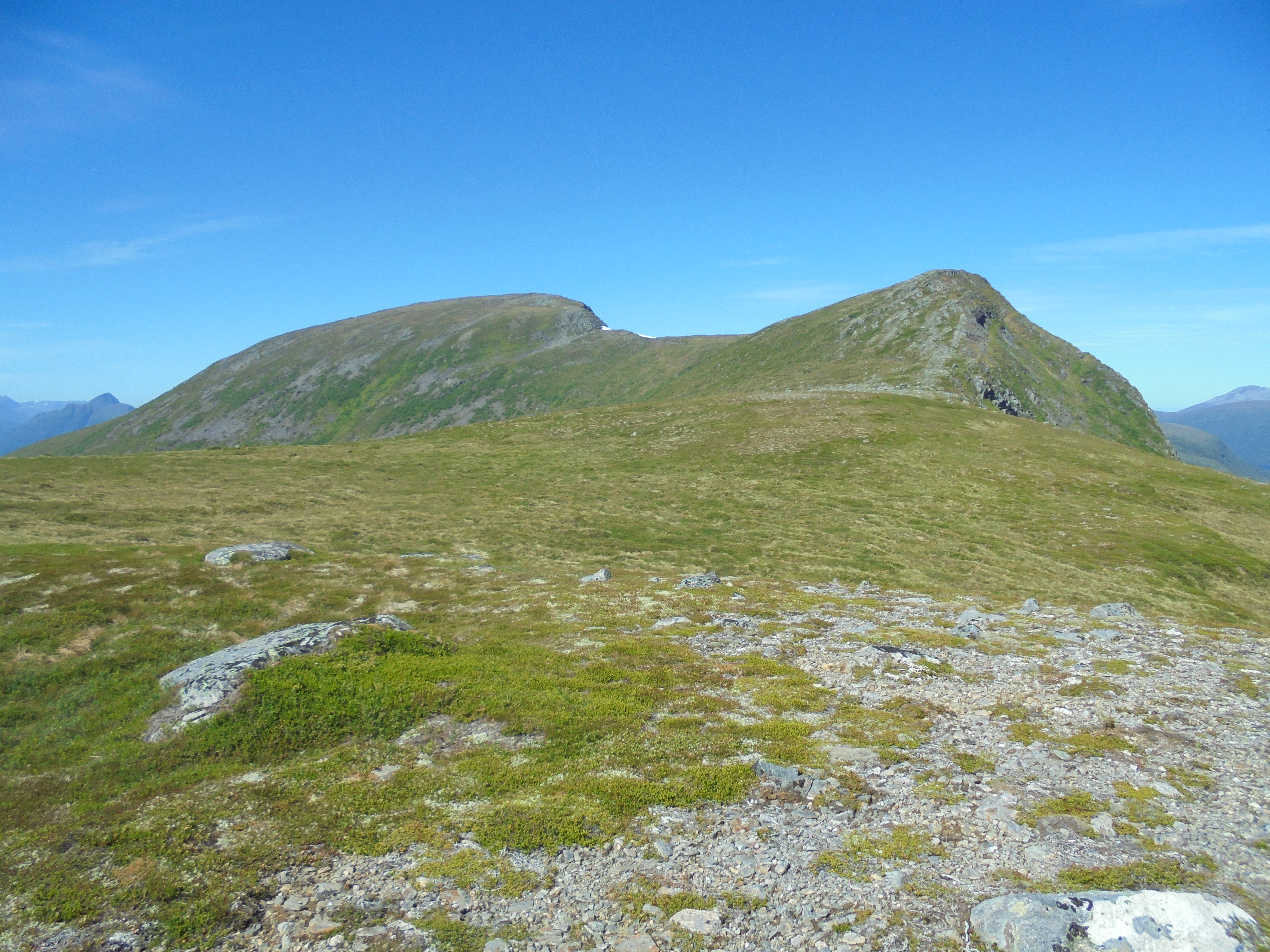 Oppe i skaret og ser mot vest med Koldafjellet til høgre og Snaufjellet til venstre. Laber bris frå nord-nordvest i god sommartemperatur.