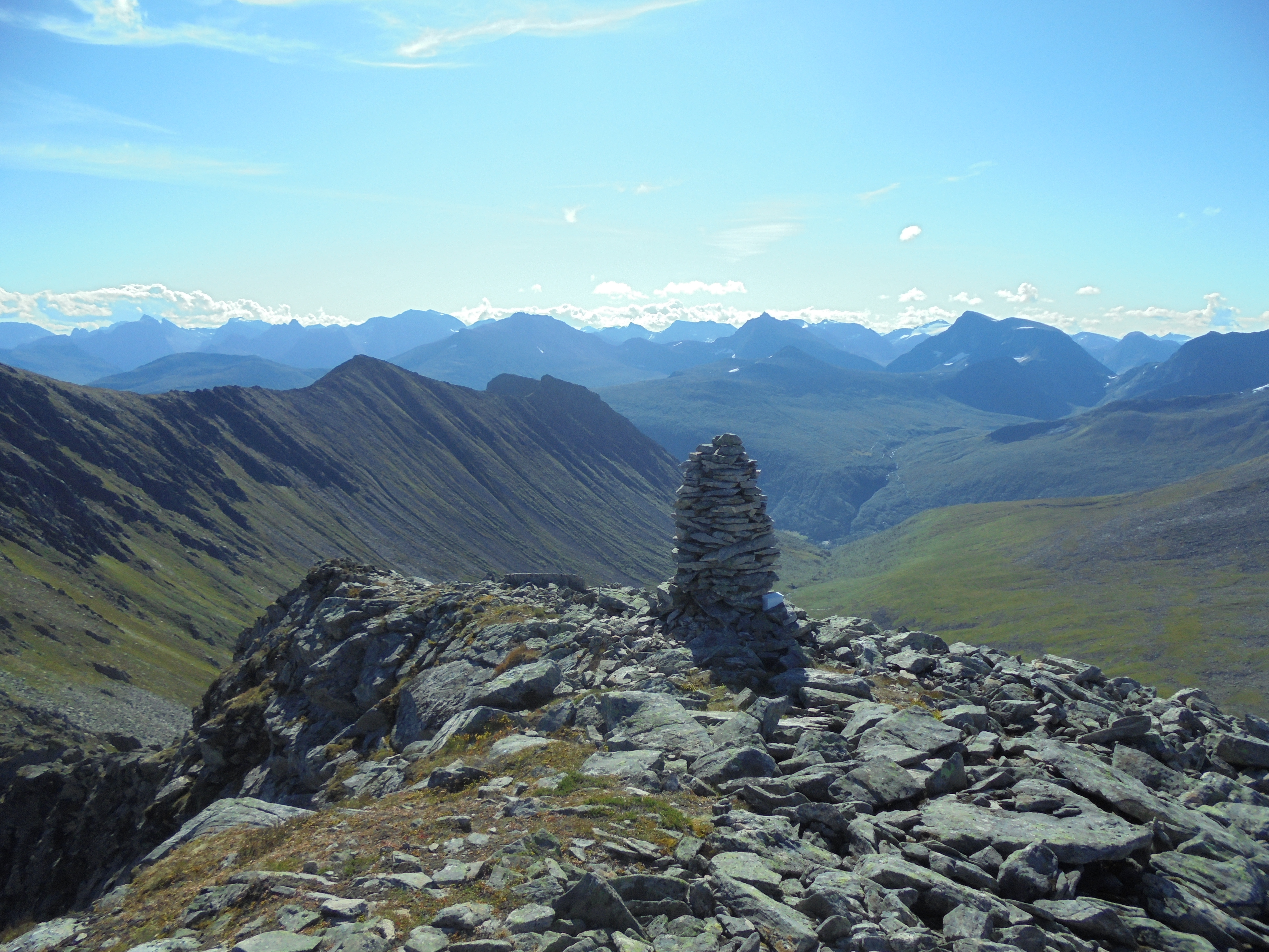 Ser mot søraust. Trolltindan, Kongen i Isterdalstindane, Finnan, Skjervan, Middagstinden og Nonstinden er mellom fjella i bakgrunnen. Venåsdalen bakom varden.