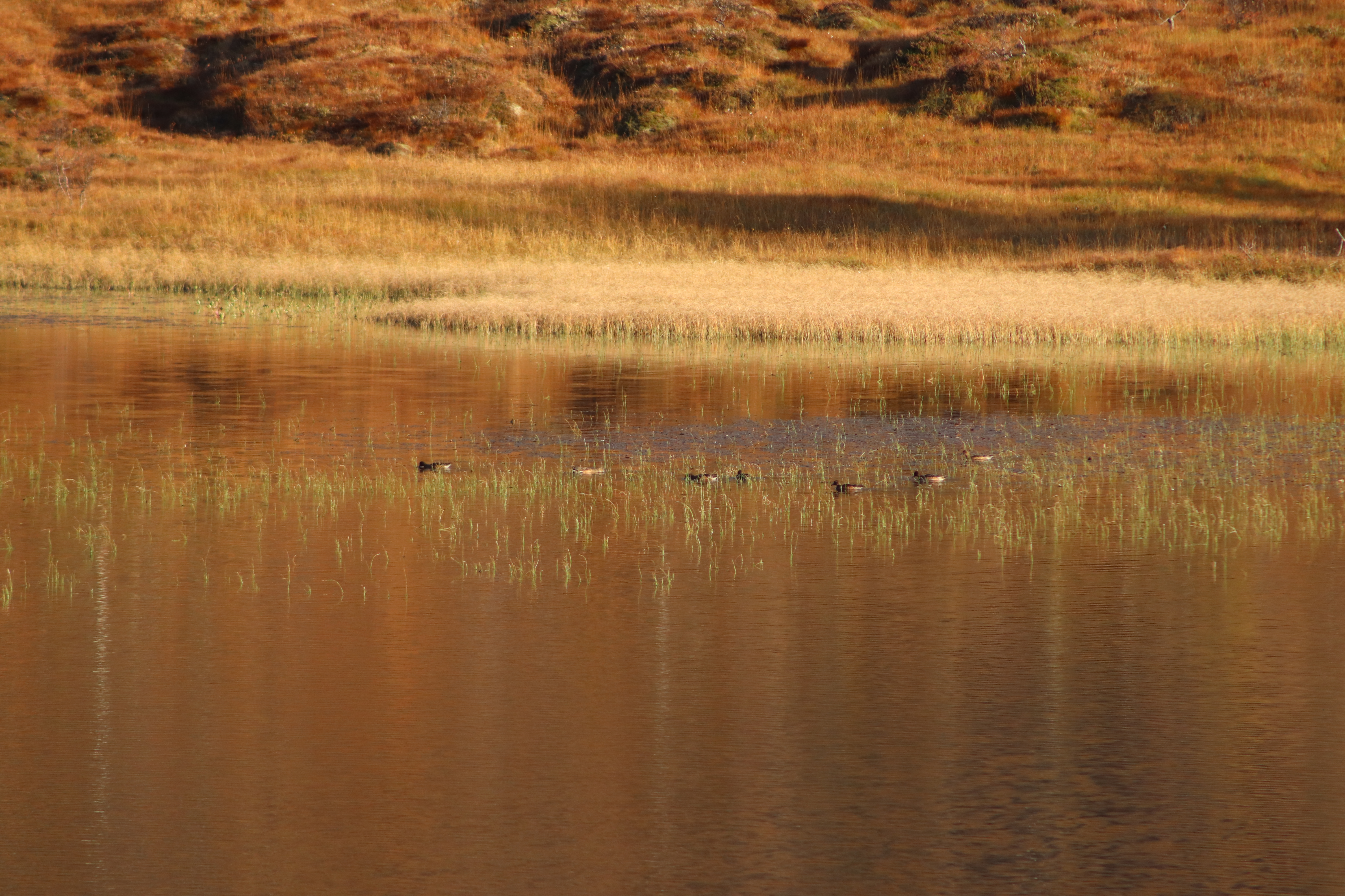Andeflokk på Kjersemvatnet. Truleg krikkand.