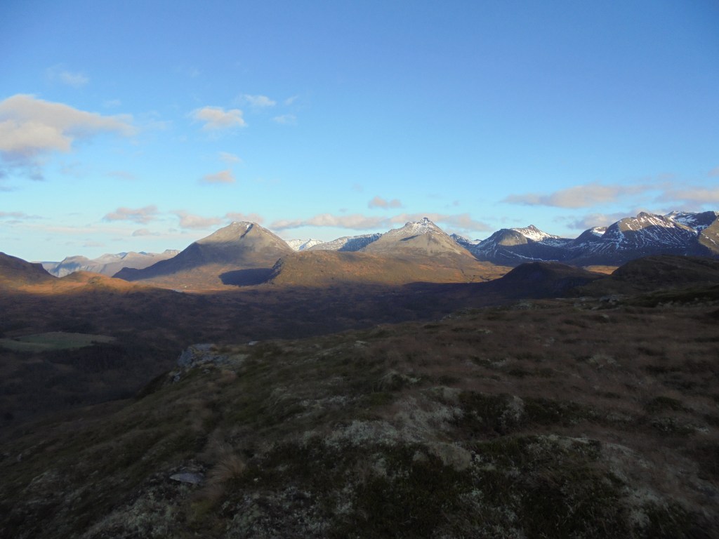 Ettermiddag 31. oktober: Laber bris frå sør-sørvest og litt hustrig trass relativt mildt vêr. Ser mot aust med Kvitnykja, Lauparen, Grytavasstinden og Fremste Skorkja som dei mest oppragande fjella.