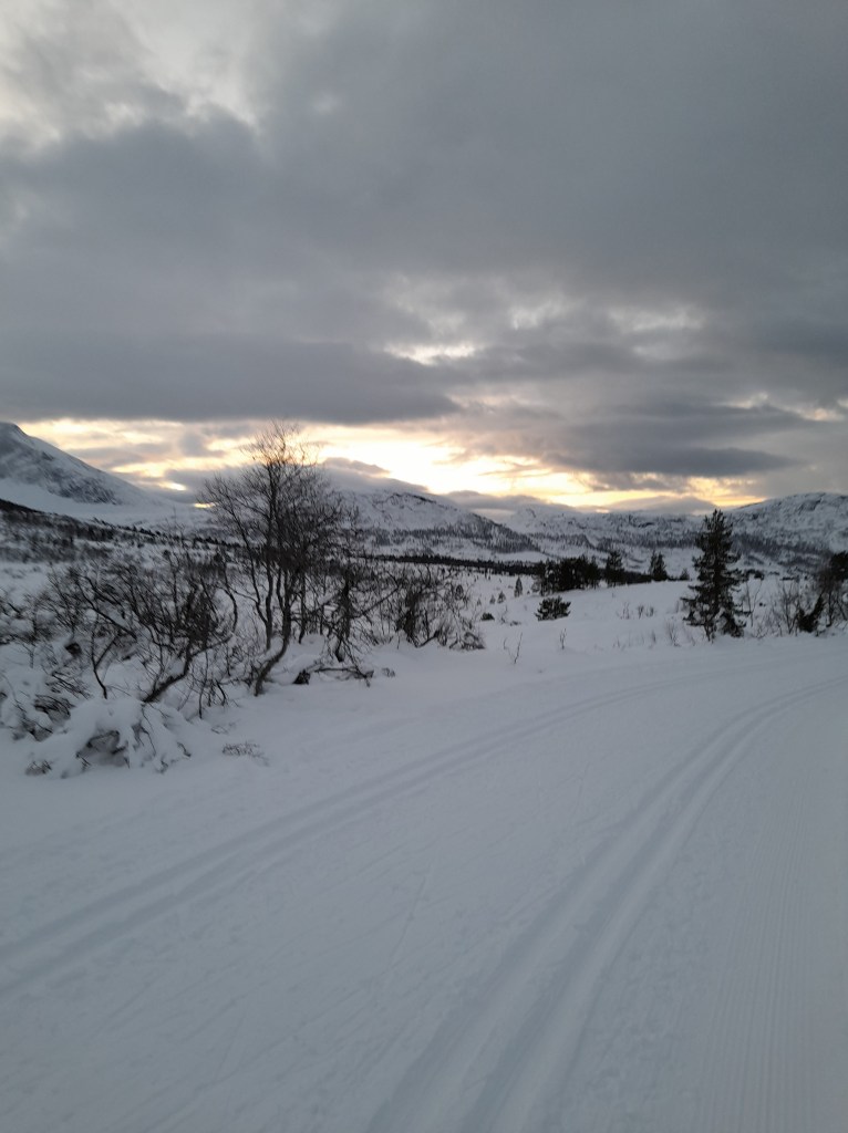 29. desember: Morgentur. Temperatur nær null. Står ved vegen sitt høgaste punkt og ser mot sørvest.
