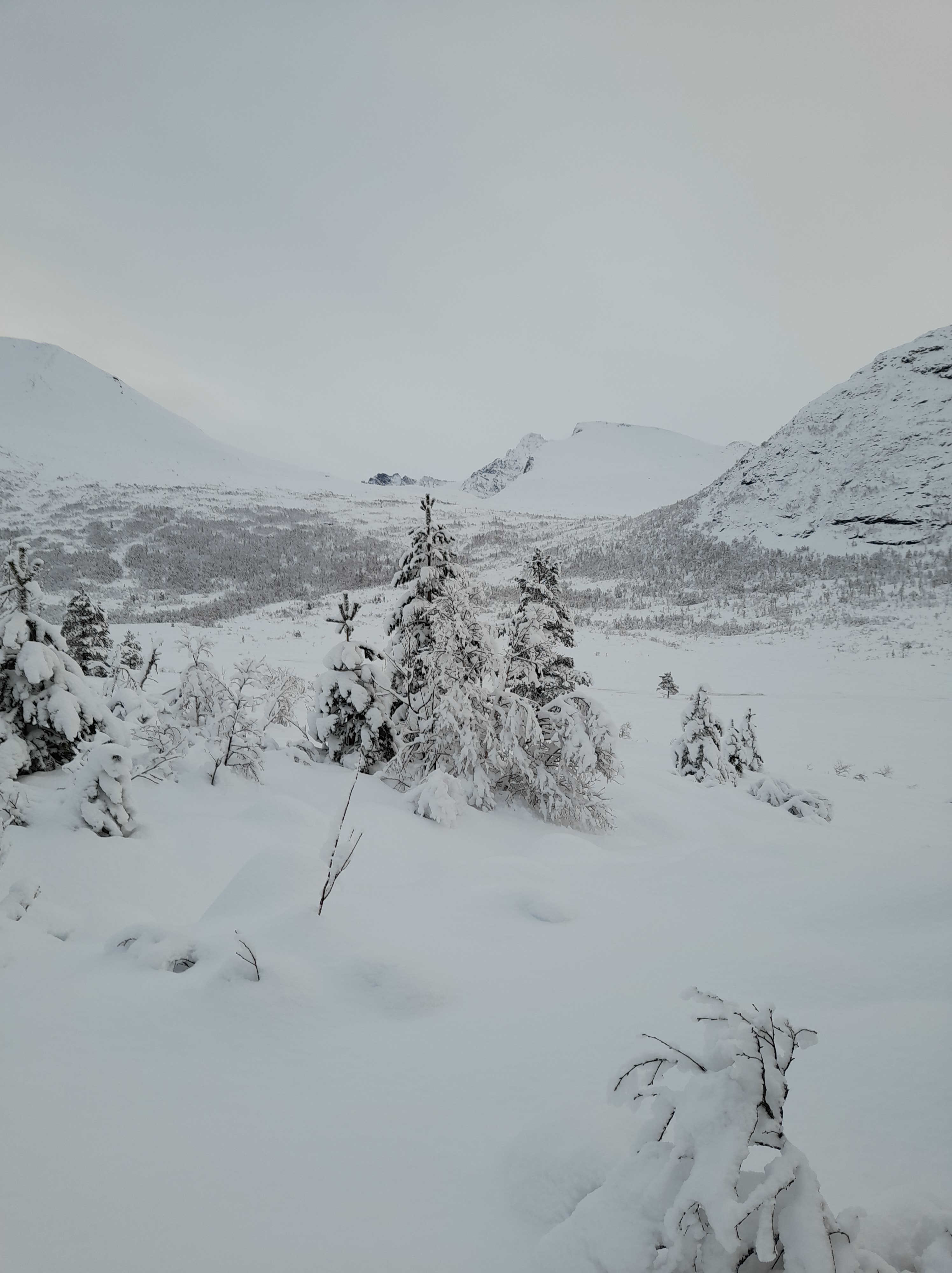 1. januar 2022: Det har kome meir turr snø, og løypa er godt preparert. Nokre få kuldegrader. Ser mot Lauparen frå høgaste partiet på vegen.