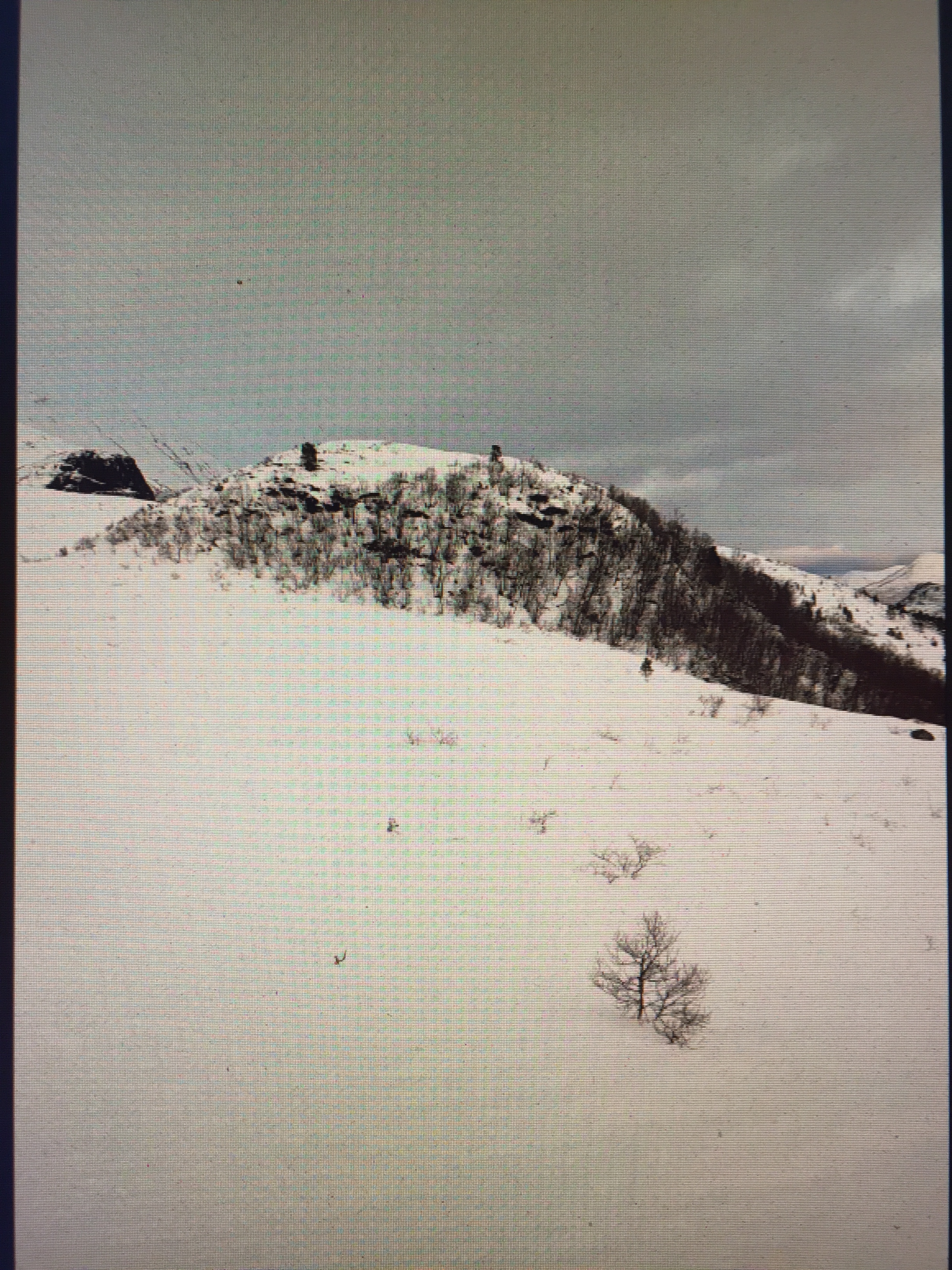 22. januar: Ser mot nordaust. Varmegrader, litt våt snø, og opptil laber bris frå sørvest i terrenget.