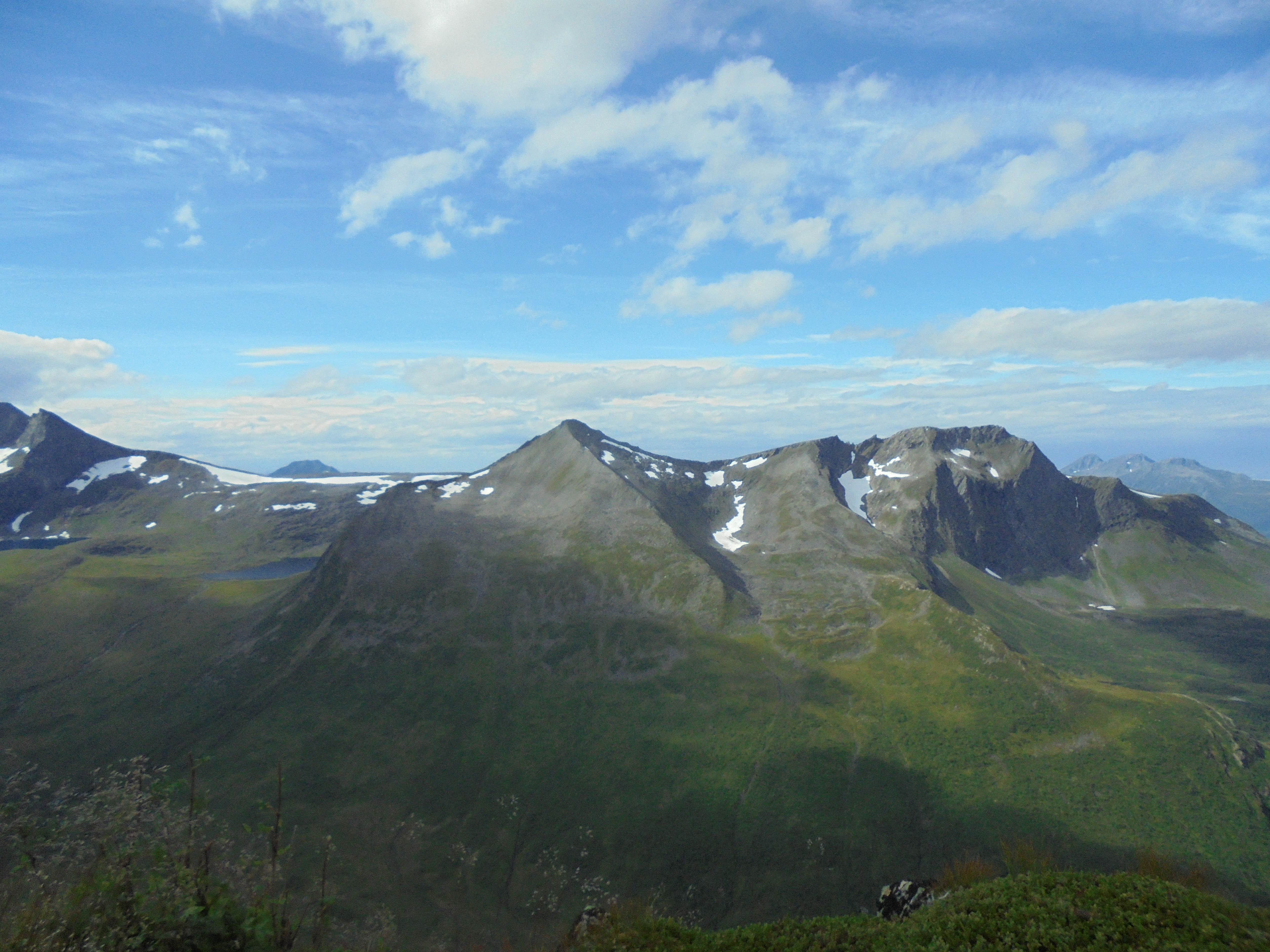 25. august: Oppe på den høgaste av Blåtindane. Varmt i lufta og lett bris frå sør eller sør-søraust. Ser mot Øspetinden i vest.