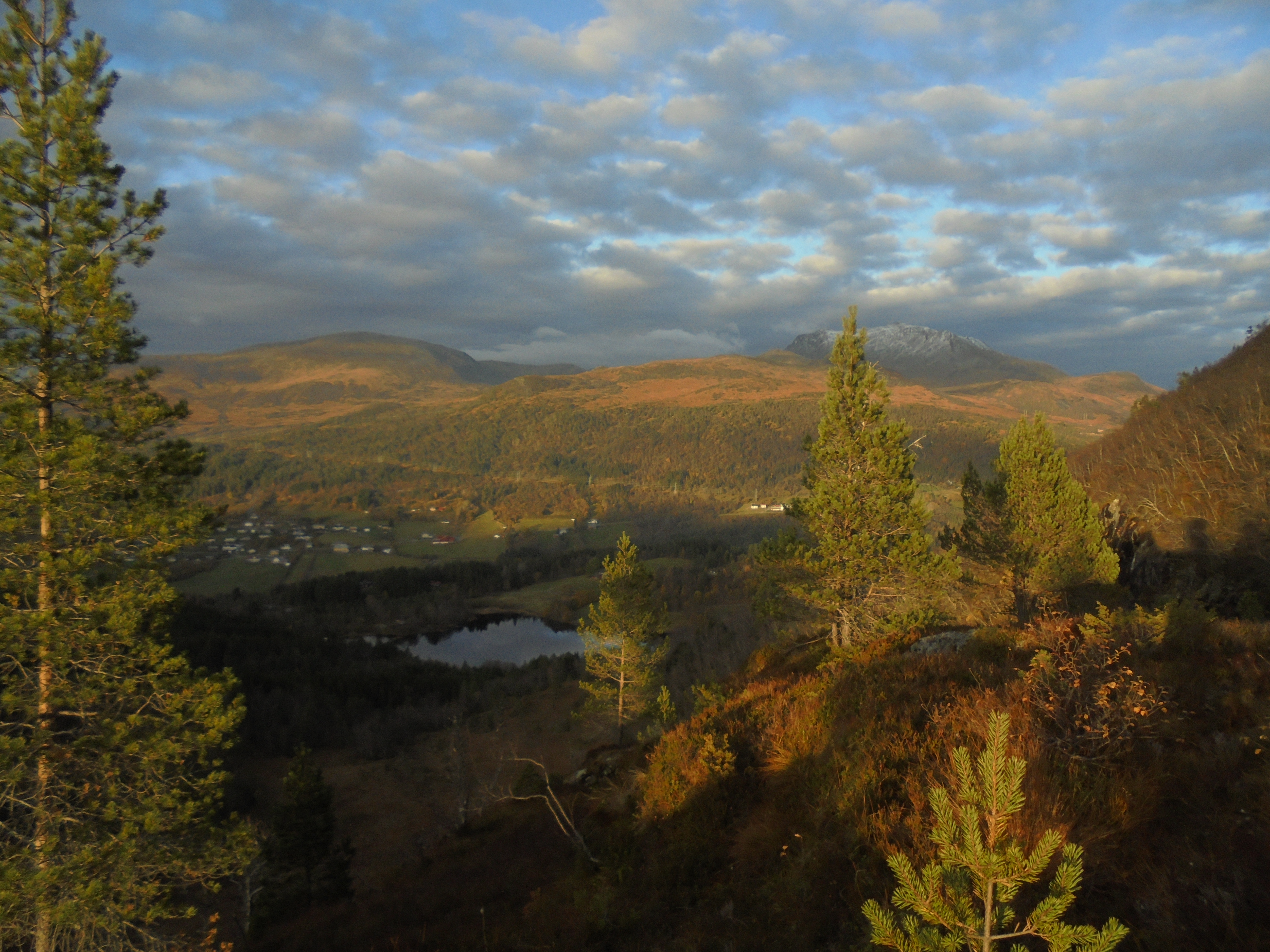 22. oktober kveld: Stoppar på ei skulder som heiter Fjellpeen. Ser ned på Hallvardsvatnet med Høgsvora i bakgrunnen til høgre.