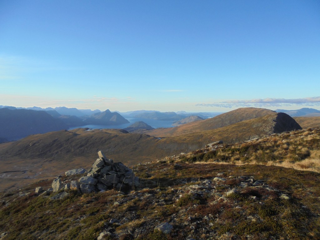 20. november: Snur her oppe. Svak eller flau vind frå aust-søraust. Fjellryggen er stort sett turr. Her og der litt is. Ser vestover. Til høgre stikk Snaufjellet opp. Geitnibba ligg nærare med ei mørk side til høgre. Langt ute til høgre ligg Storfjellet og Urdfjellet.