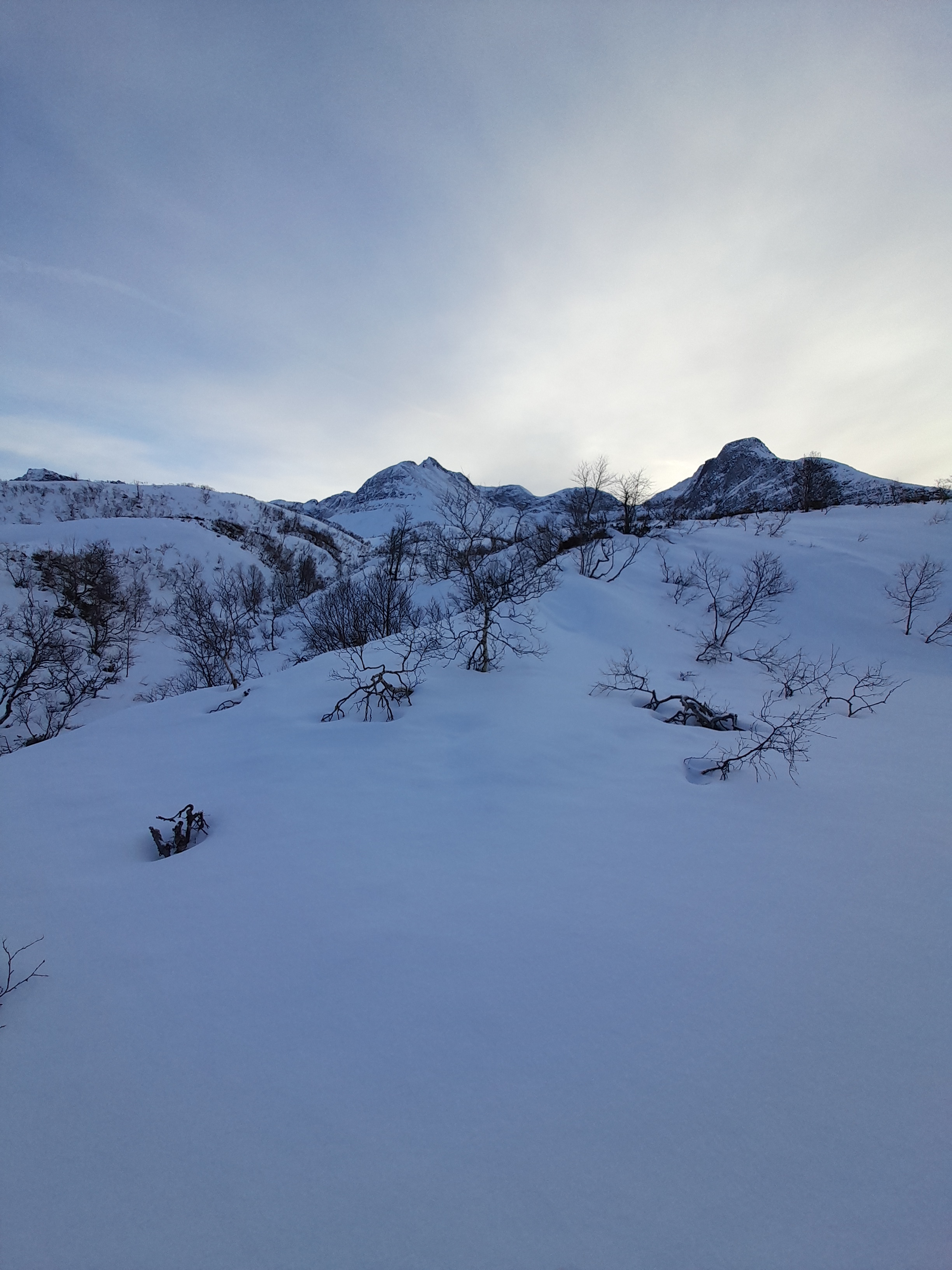 Ser inn i fjella, med Heimste Skorkja til høgre, Fremste Skorkja i midten, og skimtar litt av fjellmassivet med Grytavasstinden til venstre.