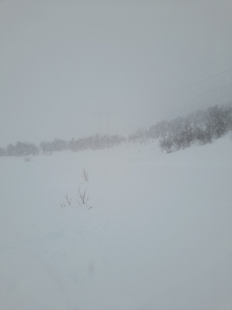 7. mars: Gjekk kveldstur oppi Grønlia i langrennsløypa. Kom ei snøbye som gjorde sikta vanskeleg.