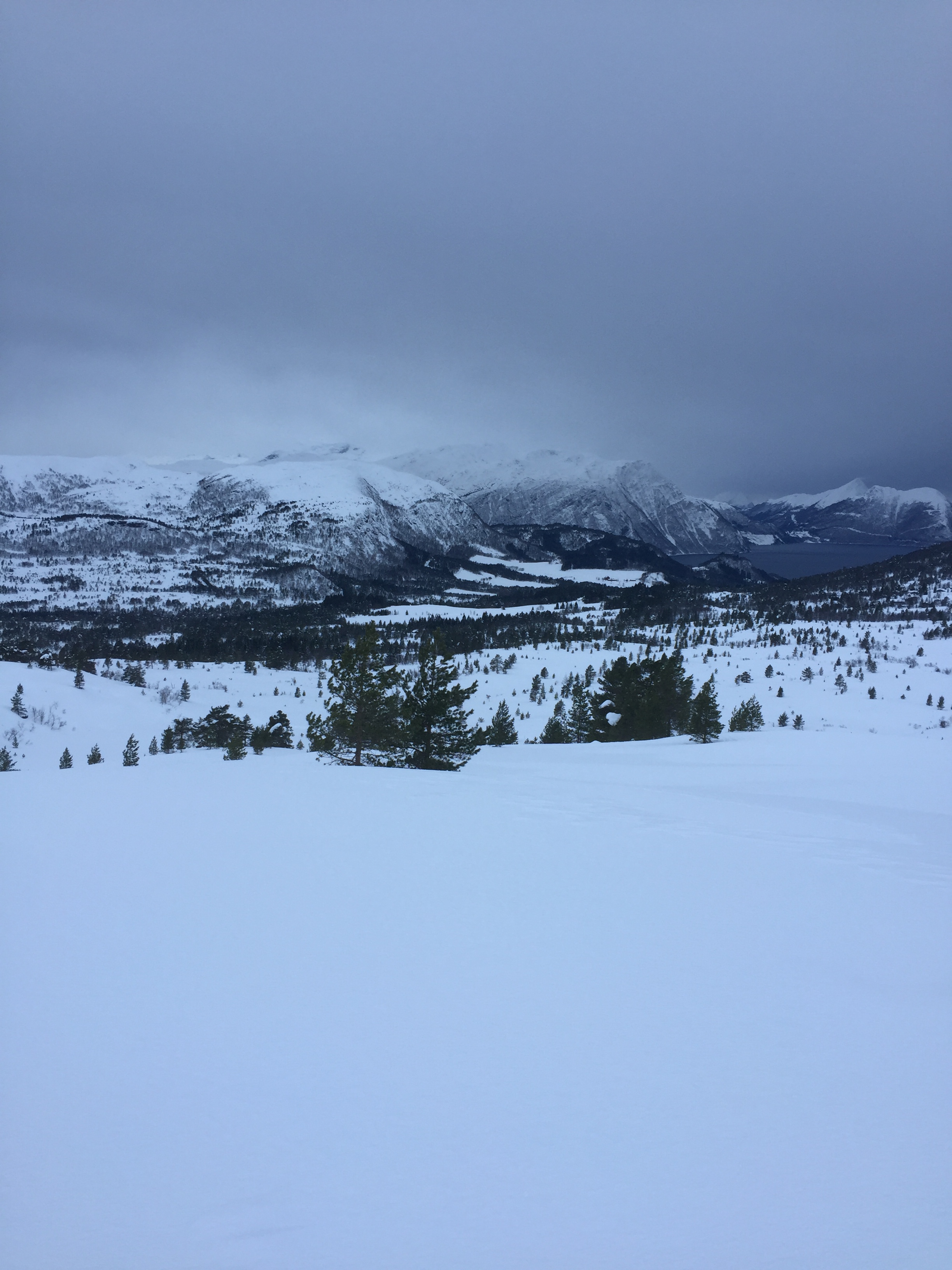 16. mars: Nesten oppe, og det er nok. Liten kuling frå søraust. Det tjuknar mot nedbør etter ein dag med sol. Det har lenge vore fokk på fjella. Snøen har ei viss bering i terrenget nedanfor. Her oppe har det vore litt fokk, og det er best å halde seg der det ikkje samlar seg for mykje snø. Ser mot vest.