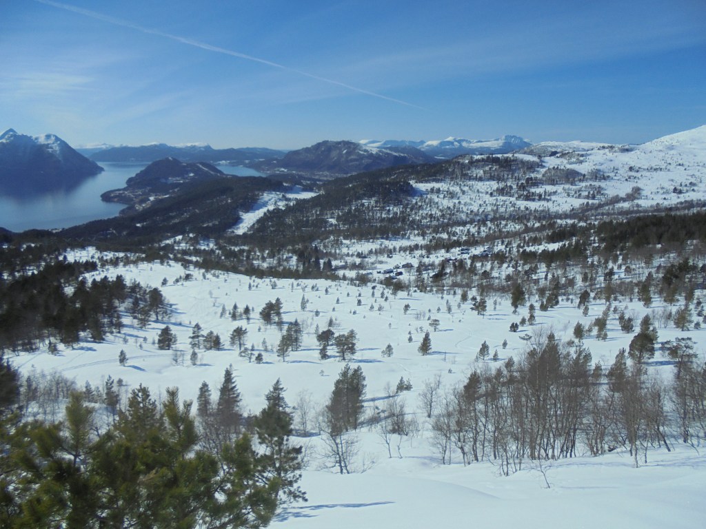 Ettermiddagstur 1. april: Har gått frå Sollisætra og vestover, og svinga nedanfor Grønnykjen. Godt føre på snø som bar godt og laga passelig med spor. Bortimot vindstilt. Snur her. Ser ned mot Vestresætra midt i bildet. Storfjorden til venstre. Åsryggen mot Gausneset til høgre for denne, og Ørskogvika til høgre for denne igjen.