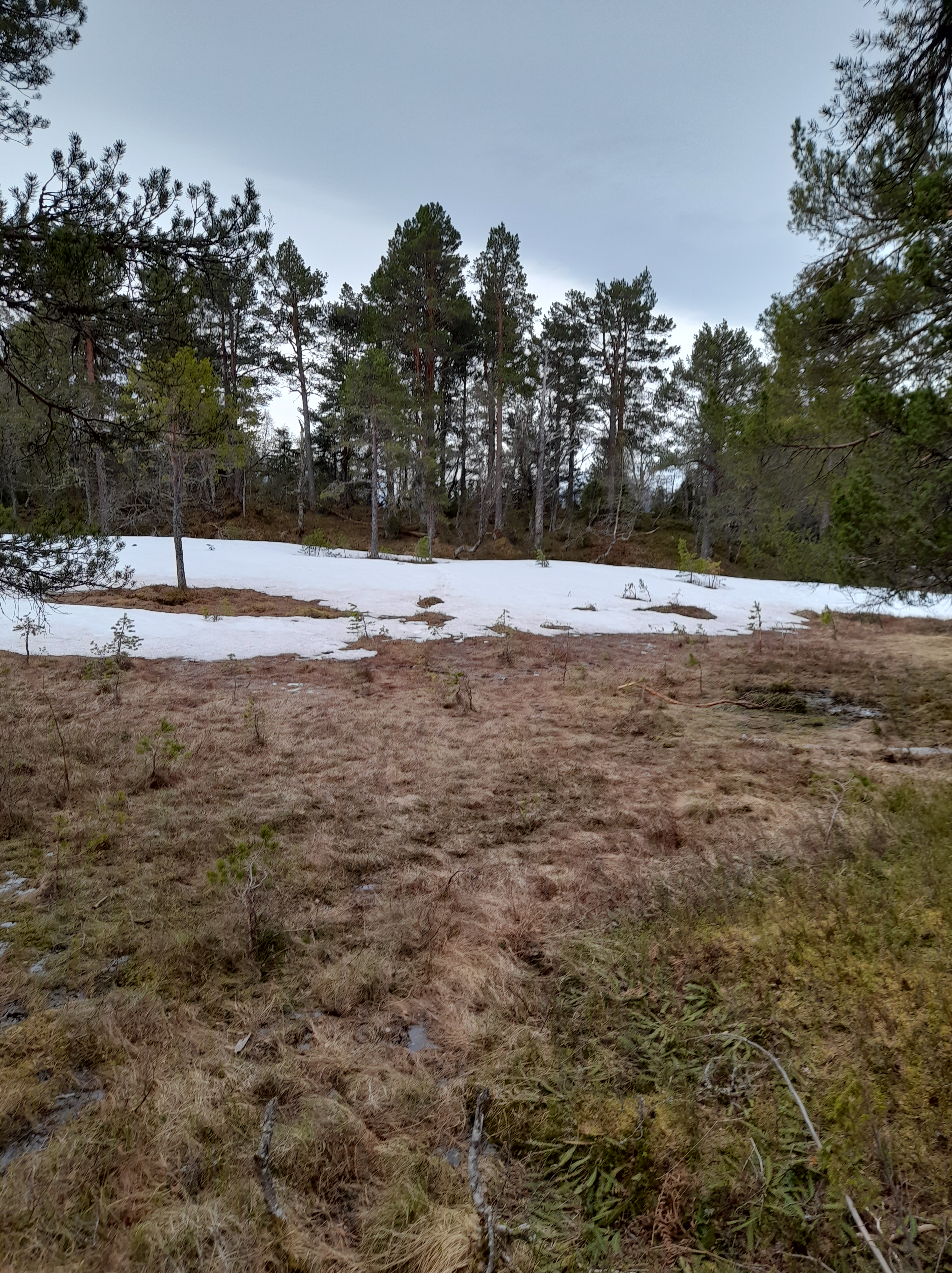 9. mai om kvelden: Her er skog og myr innpå, og enno ligg det parti med snø.
