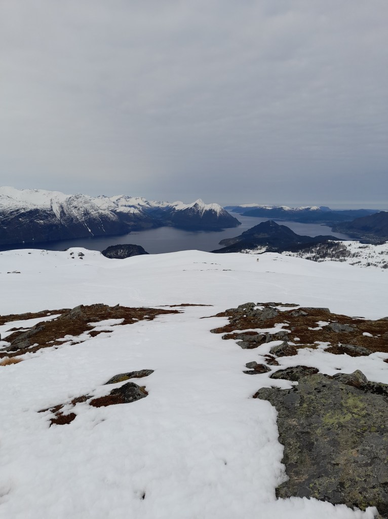 7. mai før middag: I dag var det vindstilt her oppe. Enno er det skya, seinare kom sola. Skiføret rimeleg, men ikkje godt. Snøen bar når ein kom over 400 moh. Ser mot vest mot Storfjorden.