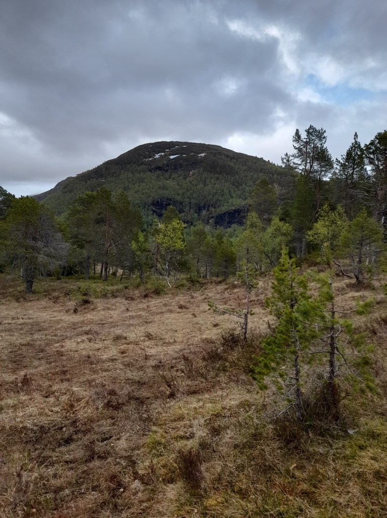 Kvelden 26. mai: Komen over høgda og går nedover på austre sida. Her er det skjerma. På vestre sida bles det ein bris. Ser mot Hallvardsfjellet.