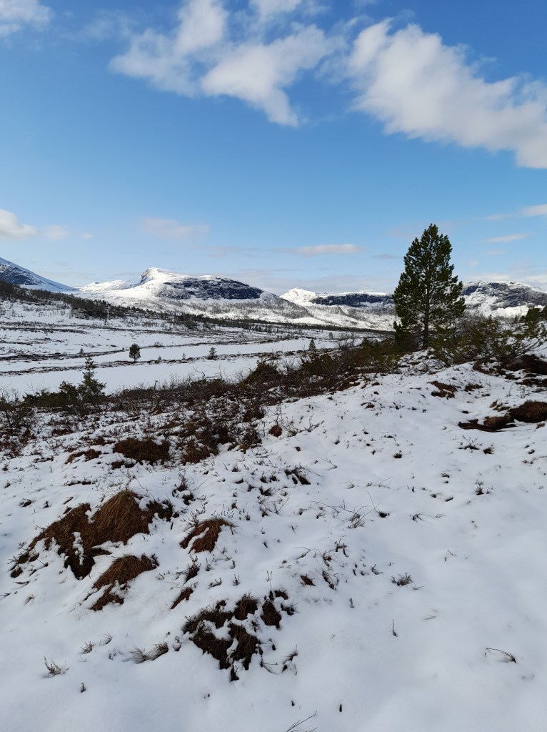 Morgenen 18. mai: Kome nysnø opp på langrennsløypa og det som er att av gamlesnø, og dermed vart det skitur. Ein vindtrekk frå vest. Mykje fuglesong og fugl i terrenget. Ser mot sørvest med dei mørke bergveggane på Skurfjellet og Bollen markant i bildet.
