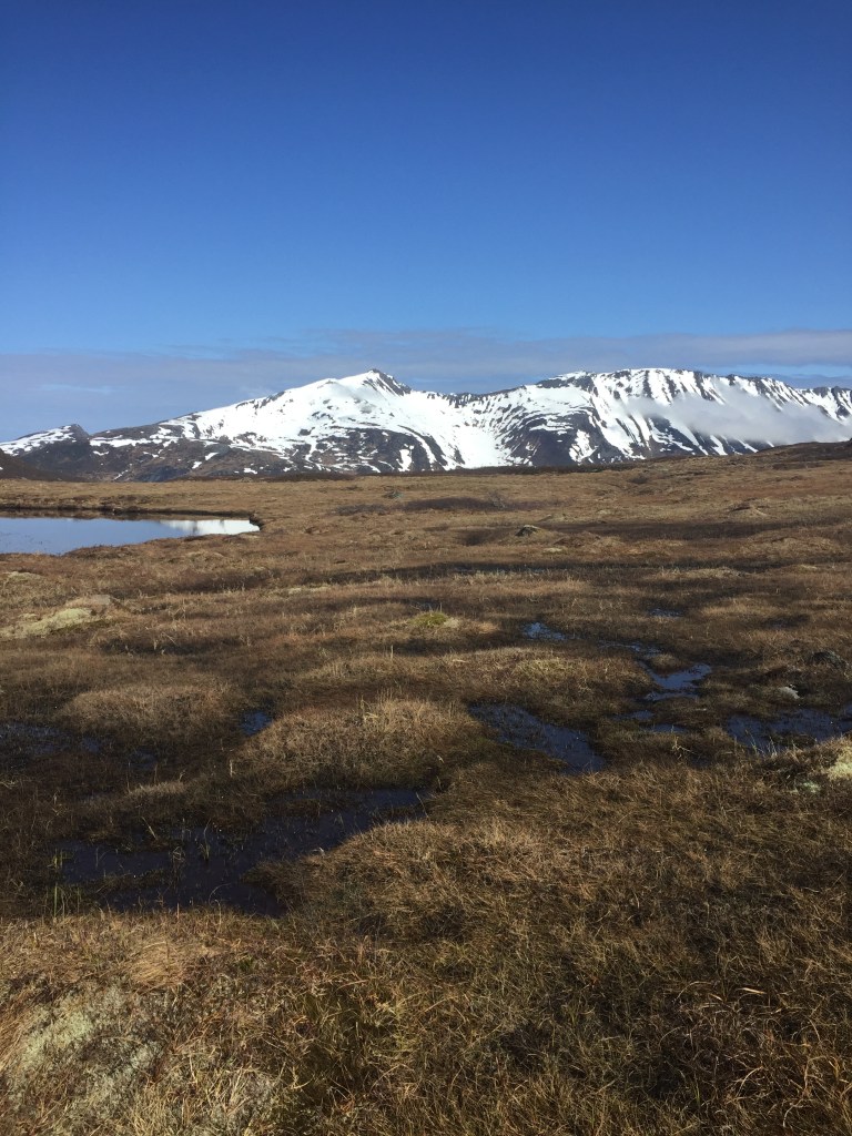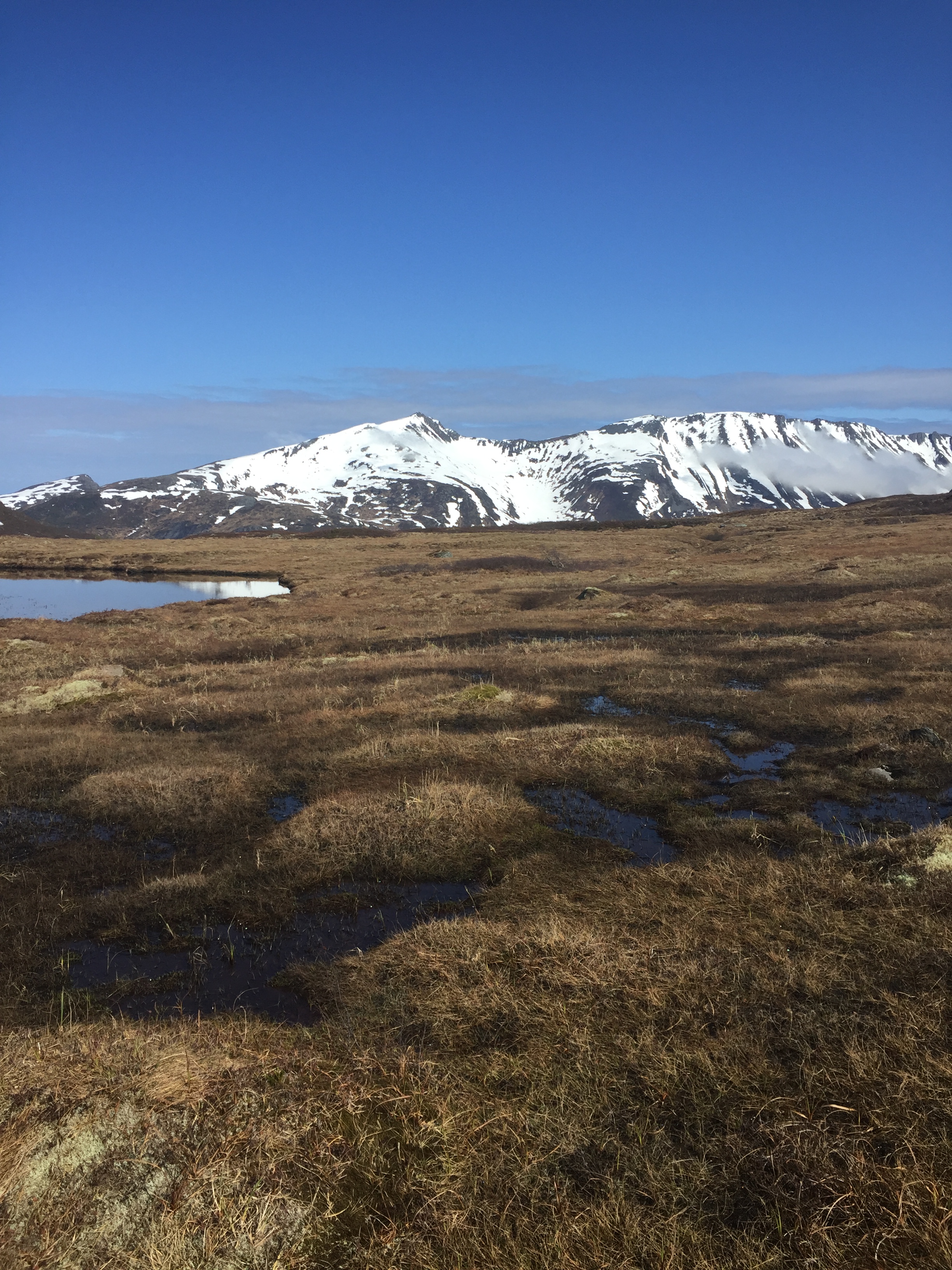 Ved Heivatna. Ser mot nord. Fjella er Høgsvora og Næremstindan. Geitnibba heilt til venstre, lengre borte, og verkar smått her.