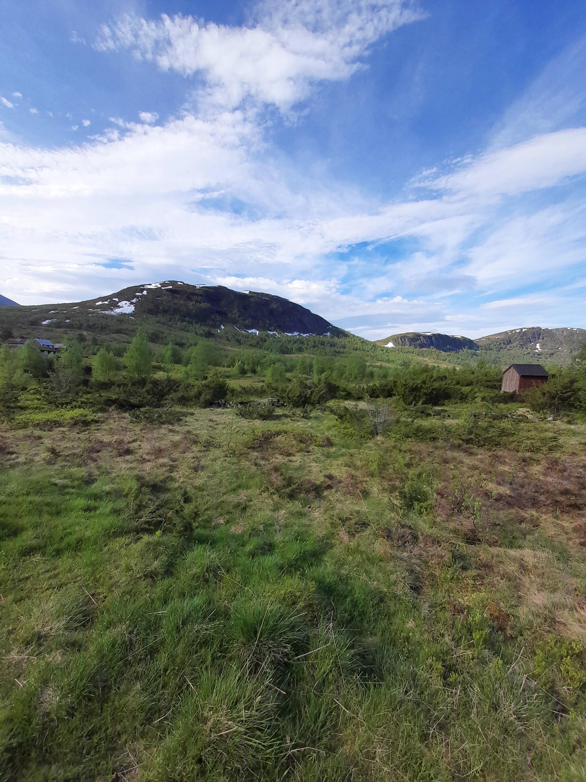 Morgenen 12. juni: Ser mot Skurfjellet. Laber bris frå søraust og rimeleg høg temperatur.