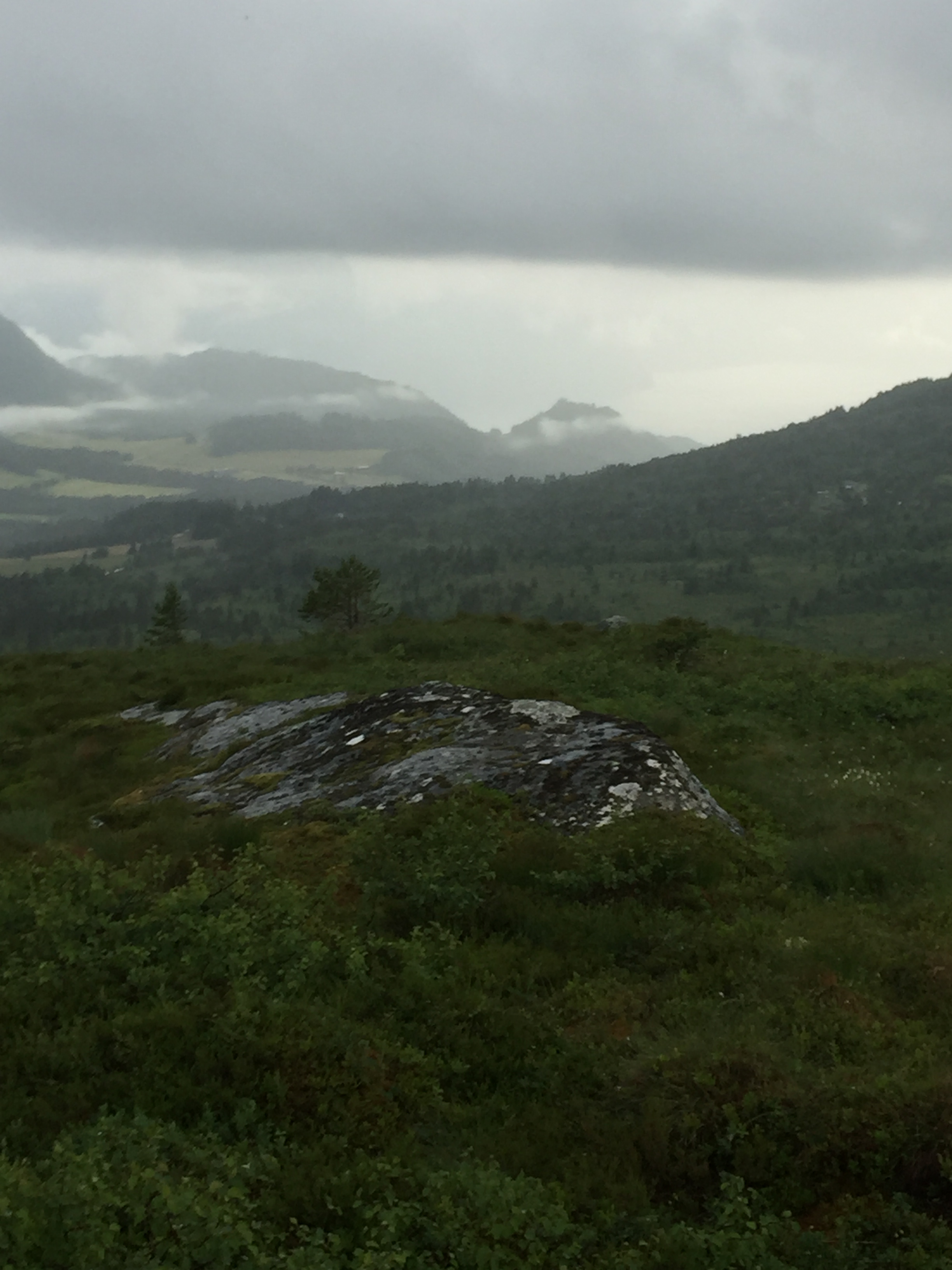 Kvelden 2. juli: Det har vore ein torefloing, og no held det fram med jamnt regn i stilt vêr. Elvane har vakse seg store.