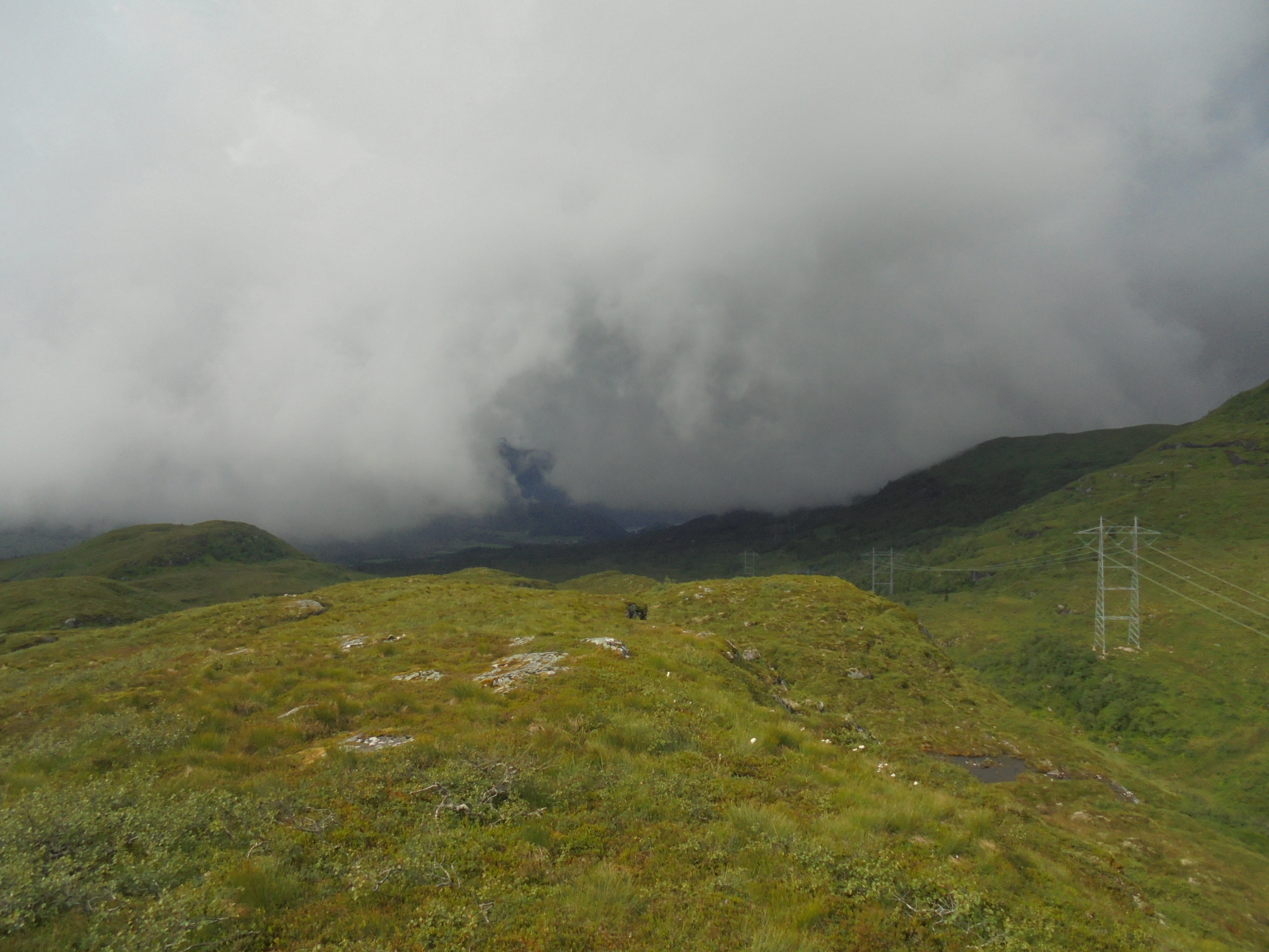 Ser mot sørvest. Det tjuknar, og borte ved fjorden regnar det.